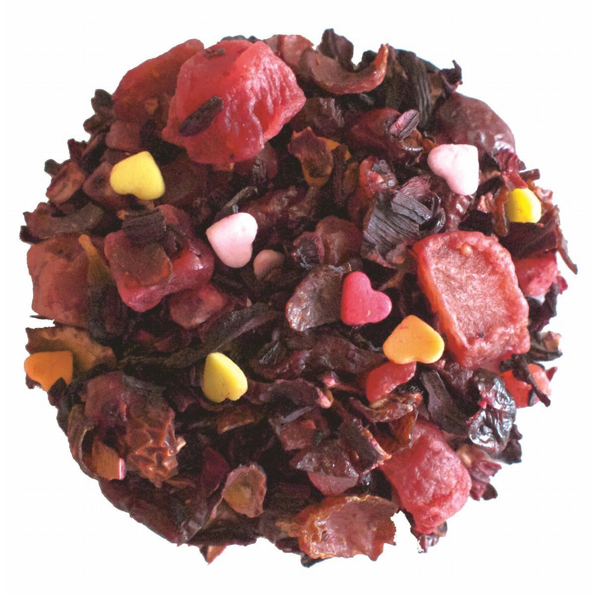 加糖ドライストロベリー(タイ製造)、有機ハイビスカス、加糖ドライパパイヤ、加糖ドライクランベリー、トンプソンレーズン、加糖ドライブルーベリー、砂糖調製品(ゼラチンを含む)/香料、クエン酸、保存料(亜硫酸塩)、増粘剤(CMC)、着色料(赤40、赤102、赤106、黄4、黄5、青1)